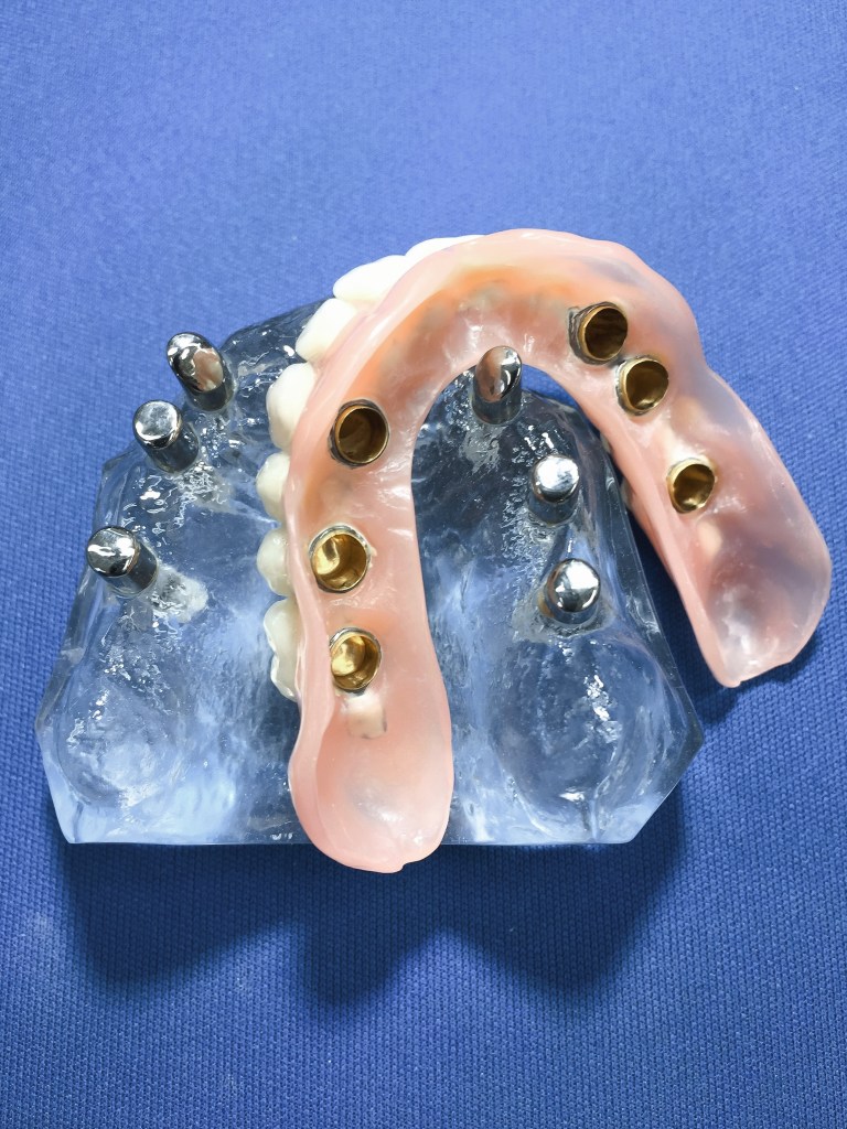 Abbildung: Implantat-Arbeit mit 6 Implantaten und teleskopierenden Kronen